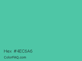 Hex #4ec6a6 Color is a normal cyan color and the nearest color is Puerto Rico #3fc1aa. Hex code #4ec6a6 and RGB value is rgb(78,198,166). In RGB color space, this color is composed of 31% red, 78% green, 65% blue, In CMYK color space, this color is composed of 61% cyan, 0% magenta, 16% yellow , 22% black , In HSL color space, this color has a hue angle of 164° , 51% saturation and 54% lightness.