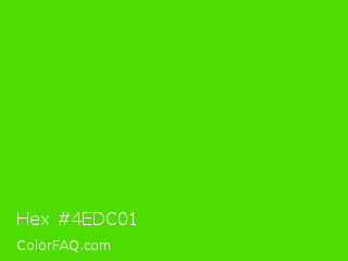 Hex #4edc01 Color is a normal green color and the nearest color is Harlequin Green #46cb18. Hex code #4edc01 and RGB value is rgb(78,220,1). In RGB color space, this color is composed of 31% red, 86% green, 0% blue, In CMYK color space, this color is composed of 65% cyan, 0% magenta, 100% yellow , 14% black , In HSL color space, this color has a hue angle of 99° , 99% saturation and 43% lightness.