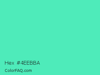 Hex #4eebba Color is a light green color and the nearest color is Turquoise #40e0d0. Hex code #4eebba and RGB value is rgb(78,235,186). In RGB color space, this color is composed of 31% red, 92% green, 73% blue, In CMYK color space, this color is composed of 67% cyan, 0% magenta, 21% yellow , 8% black , In HSL color space, this color has a hue angle of 161° , 80% saturation and 61% lightness.