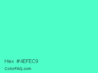 Hex #4efec9 Color is a light green color and the nearest color is Turquoise #40e0d0. Hex code #4efec9 and RGB value is rgb(78,254,201). In RGB color space, this color is composed of 31% red, 100% green, 79% blue, In CMYK color space, this color is composed of 69% cyan, 0% magenta, 21% yellow , 0% black , In HSL color space, this color has a hue angle of 162° , 99% saturation and 65% lightness.