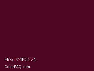 Hex #4f0621 Color is a very dark rose color and the nearest color is Castro #52001f. Hex code #4f0621 and RGB value is rgb(79,6,33). In RGB color space, this color is composed of 31% red, 2% green, 13% blue, In CMYK color space, this color is composed of 0% cyan, 92% magenta, 58% yellow , 69% black , In HSL color space, this color has a hue angle of 338° , 86% saturation and 17% lightness.