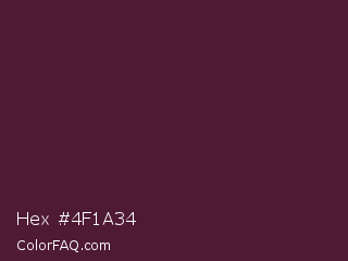 Hex #4f1a34 Color is a very dark rose color and the nearest color is Wine Berry #591d35. Hex code #4f1a34 and RGB value is rgb(79,26,52). In RGB color space, this color is composed of 31% red, 10% green, 20% blue, In CMYK color space, this color is composed of 0% cyan, 67% magenta, 34% yellow , 69% black , In HSL color space, this color has a hue angle of 331° , 50% saturation and 21% lightness.