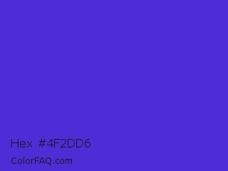Hex #4f2dd6 Color is a normal indigo color and the nearest color is Purple Heart Crayola #652dc1. Hex code #4f2dd6 and RGB value is rgb(79,45,214). In RGB color space, this color is composed of 31% red, 18% green, 84% blue, In CMYK color space, this color is composed of 63% cyan, 79% magenta, 0% yellow , 16% black , In HSL color space, this color has a hue angle of 252° , 67% saturation and 51% lightness.