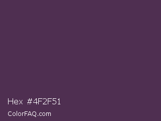 Hex #4f2f51 Color is a dark magenta color and the nearest color is Voodoo #533455. Hex code #4f2f51 and RGB value is rgb(79,47,81). In RGB color space, this color is composed of 31% red, 18% green, 32% blue, In CMYK color space, this color is composed of 2% cyan, 42% magenta, 0% yellow , 68% black , In HSL color space, this color has a hue angle of 296° , 27% saturation and 25% lightness.