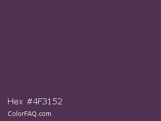 Hex #4f3152 Color is a dark magenta color and the nearest color is Voodoo #533455. Hex code #4f3152 and RGB value is rgb(79,49,82). In RGB color space, this color is composed of 31% red, 19% green, 32% blue, In CMYK color space, this color is composed of 4% cyan, 40% magenta, 0% yellow , 68% black , In HSL color space, this color has a hue angle of 295° , 25% saturation and 26% lightness.
