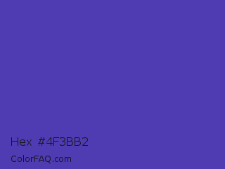 Hex #4f3bb2 Color is a normal indigo color and the nearest color is Ocean Blue #4f42b5. Hex code #4f3bb2 and RGB value is rgb(79,59,178). In RGB color space, this color is composed of 31% red, 23% green, 70% blue, In CMYK color space, this color is composed of 56% cyan, 67% magenta, 0% yellow , 30% black , In HSL color space, this color has a hue angle of 250° , 50% saturation and 46% lightness.
