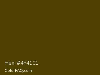Hex #4f4101 Color is a very dark yellow color and the nearest color is Bronze Olive #4e420c. Hex code #4f4101 and RGB value is rgb(79,65,1). In RGB color space, this color is composed of 31% red, 25% green, 0% blue, In CMYK color space, this color is composed of 0% cyan, 18% magenta, 99% yellow , 69% black , In HSL color space, this color has a hue angle of 49° , 98% saturation and 16% lightness.