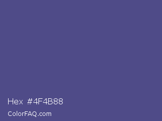 Hex #4f4b88 Color is a normal indigo color and the nearest color is Purple Navy #4e5180. Hex code #4f4b88 and RGB value is rgb(79,75,136). In RGB color space, this color is composed of 31% red, 29% green, 53% blue, In CMYK color space, this color is composed of 42% cyan, 45% magenta, 0% yellow , 47% black , In HSL color space, this color has a hue angle of 244° , 29% saturation and 41% lightness.