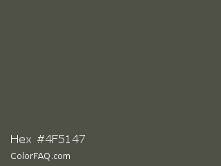 Hex #4f5147 Color is a dark lime color and the nearest color is Fuscous Gray #54534d. Hex code #4f5147 and RGB value is rgb(79,81,71). In RGB color space, this color is composed of 31% red, 32% green, 28% blue, In CMYK color space, this color is composed of 2% cyan, 0% magenta, 12% yellow , 68% black , In HSL color space, this color has a hue angle of 72° , 7% saturation and 30% lightness.