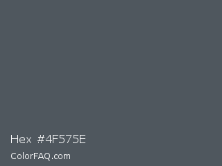 Hex #4f575e Color is a normal blue color and the nearest color is Scarpa Flow #585562. Hex code #4f575e and RGB value is rgb(79,87,94). In RGB color space, this color is composed of 31% red, 34% green, 37% blue, In CMYK color space, this color is composed of 16% cyan, 7% magenta, 0% yellow , 63% black , In HSL color space, this color has a hue angle of 208° , 9% saturation and 34% lightness.
