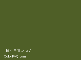 Hex #4f5f27 Color is a dark lime color and the nearest color is Dark Moss Green #4a5d23. Hex code #4f5f27 and RGB value is rgb(79,95,39). In RGB color space, this color is composed of 31% red, 37% green, 15% blue, In CMYK color space, this color is composed of 17% cyan, 0% magenta, 59% yellow , 63% black , In HSL color space, this color has a hue angle of 77° , 42% saturation and 26% lightness.