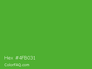 Hex #4fb031 Color is a normal green color and the nearest color is Apple #4fa83d. Hex code #4fb031 and RGB value is rgb(79,176,49). In RGB color space, this color is composed of 31% red, 69% green, 19% blue, In CMYK color space, this color is composed of 55% cyan, 0% magenta, 72% yellow , 31% black , In HSL color space, this color has a hue angle of 106° , 56% saturation and 44% lightness.