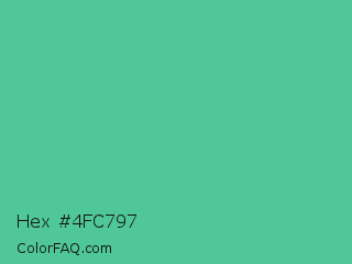 Hex #4fc797 Color is a normal green color and the nearest color is Ocean Green #48bf91. Hex code #4fc797 and RGB value is rgb(79,199,151). In RGB color space, this color is composed of 31% red, 78% green, 59% blue, In CMYK color space, this color is composed of 60% cyan, 0% magenta, 24% yellow , 22% black , In HSL color space, this color has a hue angle of 156° , 52% saturation and 55% lightness.