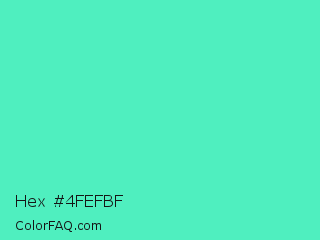 Hex #4fefbf Color is a light green color and the nearest color is Turquoise #40e0d0. Hex code #4fefbf and RGB value is rgb(79,239,191). In RGB color space, this color is composed of 31% red, 94% green, 75% blue, In CMYK color space, this color is composed of 67% cyan, 0% magenta, 20% yellow , 6% black , In HSL color space, this color has a hue angle of 162° , 83% saturation and 62% lightness.