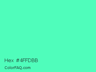 Hex #4ffdbb Color is a light green color and the nearest color is Turquoise #40e0d0. Hex code #4ffdbb and RGB value is rgb(79,253,187). In RGB color space, this color is composed of 31% red, 99% green, 73% blue, In CMYK color space, this color is composed of 69% cyan, 0% magenta, 26% yellow , 1% black , In HSL color space, this color has a hue angle of 157° , 98% saturation and 65% lightness.