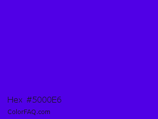 Hex #5000e6 Color is a normal violet color and the nearest color is Electric Ultramarine #3f00ff. Hex code #5000e6 and RGB value is rgb(80,0,230). In RGB color space, this color is composed of 31% red, 0% green, 90% blue, In CMYK color space, this color is composed of 65% cyan, 100% magenta, 0% yellow , 10% black , In HSL color space, this color has a hue angle of 261° , 100% saturation and 45% lightness.