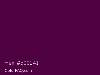 Hex #500141 Color is a very dark magenta color and the nearest color is Blackberry #4d0135. Hex code #500141 and RGB value is rgb(80,1,65). In RGB color space, this color is composed of 31% red, 0% green, 25% blue, In CMYK color space, this color is composed of 0% cyan, 99% magenta, 19% yellow , 69% black , In HSL color space, this color has a hue angle of 311° , 98% saturation and 16% lightness.