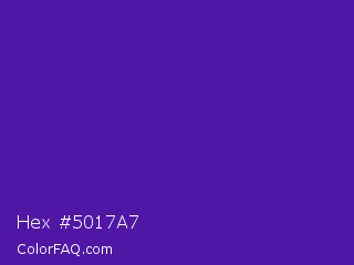 Hex #5017a7 Color is a normal violet color and the nearest color is Daisy Bush #4f2398. Hex code #5017a7 and RGB value is rgb(80,23,167). In RGB color space, this color is composed of 31% red, 9% green, 65% blue, In CMYK color space, this color is composed of 52% cyan, 86% magenta, 0% yellow , 35% black , In HSL color space, this color has a hue angle of 264° , 76% saturation and 37% lightness.