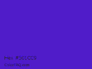 Hex #501cc9 Color is a normal indigo color and the nearest color is Purple Heart Crayola #652dc1. Hex code #501cc9 and RGB value is rgb(80,28,201). In RGB color space, this color is composed of 31% red, 11% green, 79% blue, In CMYK color space, this color is composed of 60% cyan, 86% magenta, 0% yellow , 21% black , In HSL color space, this color has a hue angle of 258° , 76% saturation and 45% lightness.