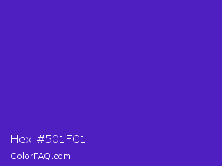Hex #501fc1 Color is a normal indigo color and the nearest color is Purple Heart Crayola #652dc1. Hex code #501fc1 and RGB value is rgb(80,31,193). In RGB color space, this color is composed of 31% red, 12% green, 76% blue, In CMYK color space, this color is composed of 59% cyan, 84% magenta, 0% yellow , 24% black , In HSL color space, this color has a hue angle of 258° , 72% saturation and 44% lightness.