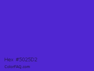Hex #5025d2 Color is a normal indigo color and the nearest color is Purple Heart Crayola #652dc1. Hex code #5025d2 and RGB value is rgb(80,37,210). In RGB color space, this color is composed of 31% red, 15% green, 82% blue, In CMYK color space, this color is composed of 62% cyan, 82% magenta, 0% yellow , 18% black , In HSL color space, this color has a hue angle of 255° , 70% saturation and 48% lightness.