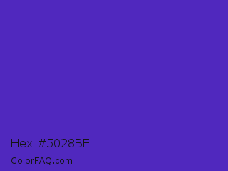 Hex #5028be Color is a normal indigo color and the nearest color is Purple Heart Crayola #652dc1. Hex code #5028be and RGB value is rgb(80,40,190). In RGB color space, this color is composed of 31% red, 16% green, 75% blue, In CMYK color space, this color is composed of 58% cyan, 79% magenta, 0% yellow , 25% black , In HSL color space, this color has a hue angle of 256° , 65% saturation and 45% lightness.