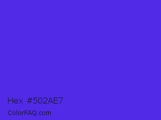 Hex #502ae7 Color is a normal indigo color and the nearest color is Han Purple #5218fa. Hex code #502ae7 and RGB value is rgb(80,42,231). In RGB color space, this color is composed of 31% red, 16% green, 91% blue, In CMYK color space, this color is composed of 65% cyan, 82% magenta, 0% yellow , 9% black , In HSL color space, this color has a hue angle of 252° , 80% saturation and 54% lightness.