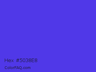 Hex #5038e8 Color is a normal indigo color and the nearest color is Majorelle Blue #6050dc. Hex code #5038e8 and RGB value is rgb(80,56,232). In RGB color space, this color is composed of 31% red, 22% green, 91% blue, In CMYK color space, this color is composed of 66% cyan, 76% magenta, 0% yellow , 9% black , In HSL color space, this color has a hue angle of 248° , 79% saturation and 56% lightness.