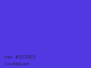 Hex #5039e3 Color is a normal indigo color and the nearest color is Majorelle Blue #6050dc. Hex code #5039e3 and RGB value is rgb(80,57,227). In RGB color space, this color is composed of 31% red, 22% green, 89% blue, In CMYK color space, this color is composed of 65% cyan, 75% magenta, 0% yellow , 11% black , In HSL color space, this color has a hue angle of 248° , 75% saturation and 56% lightness.