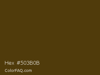 Hex #503b0b Color is a very dark orange color and the nearest color is Pineapple #563c0d. Hex code #503b0b and RGB value is rgb(80,59,11). In RGB color space, this color is composed of 31% red, 23% green, 4% blue, In CMYK color space, this color is composed of 0% cyan, 26% magenta, 86% yellow , 69% black , In HSL color space, this color has a hue angle of 42° , 76% saturation and 18% lightness.
