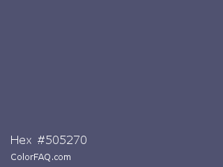 Hex #505270 Color is a normal blue color and the nearest color is Independence #4c516d. Hex code #505270 and RGB value is rgb(80,82,112). In RGB color space, this color is composed of 31% red, 32% green, 44% blue, In CMYK color space, this color is composed of 29% cyan, 27% magenta, 0% yellow , 56% black , In HSL color space, this color has a hue angle of 236° , 17% saturation and 38% lightness.