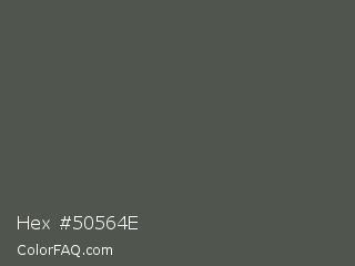 Hex #50564e Color is a normal green color and the nearest color is Fuscous Gray #54534d. Hex code #50564e and RGB value is rgb(80,86,78). In RGB color space, this color is composed of 31% red, 34% green, 31% blue, In CMYK color space, this color is composed of 7% cyan, 0% magenta, 9% yellow , 66% black , In HSL color space, this color has a hue angle of 105° , 5% saturation and 32% lightness.