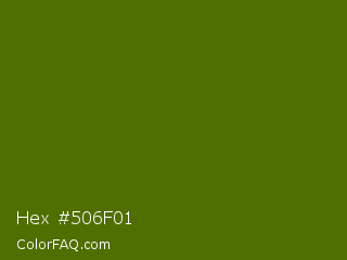Hex #506f01 Color is a very dark lime color and the nearest color is Green Leaf #436a0d. Hex code #506f01 and RGB value is rgb(80,111,1). In RGB color space, this color is composed of 31% red, 44% green, 0% blue, In CMYK color space, this color is composed of 28% cyan, 0% magenta, 99% yellow , 56% black , In HSL color space, this color has a hue angle of 77° , 98% saturation and 22% lightness.