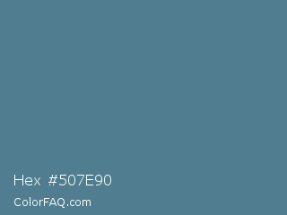 Hex #507e90 Color is a normal blue color and the nearest color is Smalt Blue #51808f. Hex code #507e90 and RGB value is rgb(80,126,144). In RGB color space, this color is composed of 31% red, 49% green, 56% blue, In CMYK color space, this color is composed of 44% cyan, 13% magenta, 0% yellow , 44% black , In HSL color space, this color has a hue angle of 197° , 29% saturation and 44% lightness.
