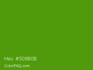 Hex #509b0b Color is a normal green color and the nearest color is Vida Loca #549019. Hex code #509b0b and RGB value is rgb(80,155,11). In RGB color space, this color is composed of 31% red, 61% green, 4% blue, In CMYK color space, this color is composed of 48% cyan, 0% magenta, 93% yellow , 39% black , In HSL color space, this color has a hue angle of 91° , 87% saturation and 33% lightness.