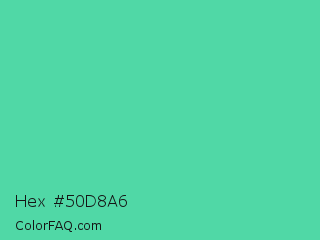 Hex #50d8a6 Color is a normal green color and the nearest color is Eucalyptus #44d7a8. Hex code #50d8a6 and RGB value is rgb(80,216,166). In RGB color space, this color is composed of 31% red, 85% green, 65% blue, In CMYK color space, this color is composed of 63% cyan, 0% magenta, 23% yellow , 15% black , In HSL color space, this color has a hue angle of 158° , 64% saturation and 58% lightness.