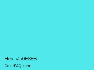 Hex #50e8eb Color is a light cyan color and the nearest color is Turquoise Blue #6cdae7. Hex code #50e8eb and RGB value is rgb(80,232,235). In RGB color space, this color is composed of 31% red, 91% green, 92% blue, In CMYK color space, this color is composed of 66% cyan, 1% magenta, 0% yellow , 8% black , In HSL color space, this color has a hue angle of 181° , 79% saturation and 62% lightness.