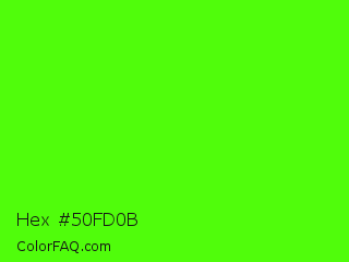 Hex #50fd0b Color is a normal green color and the nearest color is Chlorophyll Green #4aff00. Hex code #50fd0b and RGB value is rgb(80,253,11). In RGB color space, this color is composed of 31% red, 99% green, 4% blue, In CMYK color space, this color is composed of 68% cyan, 0% magenta, 96% yellow , 1% black , In HSL color space, this color has a hue angle of 103° , 98% saturation and 52% lightness.