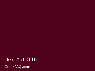 Hex #51011b Color is a very dark rose color and the nearest color is Castro #52001f. Hex code #51011b and RGB value is rgb(81,1,27). In RGB color space, this color is composed of 32% red, 0% green, 11% blue, In CMYK color space, this color is composed of 0% cyan, 99% magenta, 67% yellow , 68% black , In HSL color space, this color has a hue angle of 341° , 98% saturation and 16% lightness.