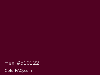 Hex #510122 Color is a very dark rose color and the nearest color is Castro #52001f. Hex code #510122 and RGB value is rgb(81,1,34). In RGB color space, this color is composed of 32% red, 0% green, 13% blue, In CMYK color space, this color is composed of 0% cyan, 99% magenta, 58% yellow , 68% black , In HSL color space, this color has a hue angle of 335° , 98% saturation and 16% lightness.