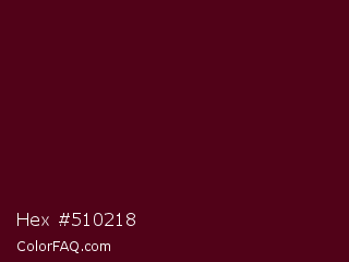 Hex #510218 Color is a very dark rose color and the nearest color is Dark Scarlet #560319. Hex code #510218 and RGB value is rgb(81,2,24). In RGB color space, this color is composed of 32% red, 1% green, 9% blue, In CMYK color space, this color is composed of 0% cyan, 98% magenta, 70% yellow , 68% black , In HSL color space, this color has a hue angle of 343° , 95% saturation and 16% lightness.