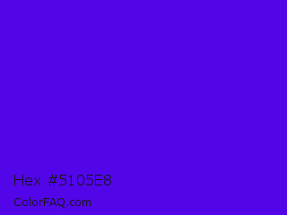 Hex #5105e8 Color is a normal indigo color and the nearest color is Han Purple #5218fa. Hex code #5105e8 and RGB value is rgb(81,5,232). In RGB color space, this color is composed of 32% red, 2% green, 91% blue, In CMYK color space, this color is composed of 65% cyan, 98% magenta, 0% yellow , 9% black , In HSL color space, this color has a hue angle of 260° , 96% saturation and 46% lightness.