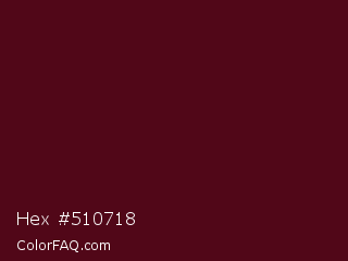 Hex #510718 Color is a very dark red color and the nearest color is Cab Sav #4d0a18. Hex code #510718 and RGB value is rgb(81,7,24). In RGB color space, this color is composed of 32% red, 3% green, 9% blue, In CMYK color space, this color is composed of 0% cyan, 91% magenta, 70% yellow , 68% black , In HSL color space, this color has a hue angle of 346° , 84% saturation and 17% lightness.