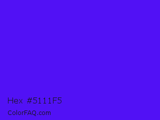 Hex #5111f5 Color is a normal indigo color and the nearest color is Han Purple #5218fa. Hex code #5111f5 and RGB value is rgb(81,17,245). In RGB color space, this color is composed of 32% red, 7% green, 96% blue, In CMYK color space, this color is composed of 67% cyan, 93% magenta, 0% yellow , 4% black , In HSL color space, this color has a hue angle of 257° , 92% saturation and 51% lightness.