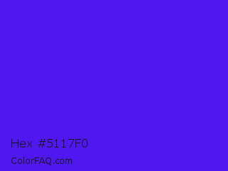 Hex #5117f0 Color is a normal indigo color and the nearest color is Han Purple #5218fa. Hex code #5117f0 and RGB value is rgb(81,23,240). In RGB color space, this color is composed of 32% red, 9% green, 94% blue, In CMYK color space, this color is composed of 66% cyan, 90% magenta, 0% yellow , 6% black , In HSL color space, this color has a hue angle of 256° , 88% saturation and 52% lightness.