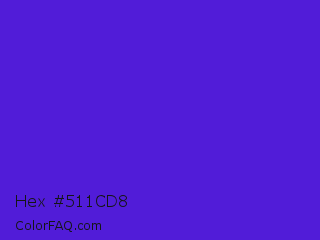 Hex #511cd8 Color is a normal indigo color and the nearest color is Interdimensional Blue #360ccc. Hex code #511cd8 and RGB value is rgb(81,28,216). In RGB color space, this color is composed of 32% red, 11% green, 85% blue, In CMYK color space, this color is composed of 63% cyan, 87% magenta, 0% yellow , 15% black , In HSL color space, this color has a hue angle of 257° , 77% saturation and 48% lightness.