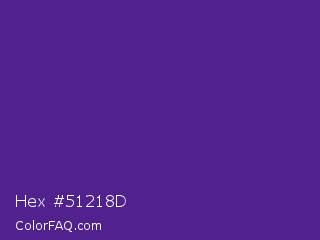 Hex #51218d Color is a normal violet color and the nearest color is KSU Purple #512888. Hex code #51218d and RGB value is rgb(81,33,141). In RGB color space, this color is composed of 32% red, 13% green, 55% blue, In CMYK color space, this color is composed of 43% cyan, 77% magenta, 0% yellow , 45% black , In HSL color space, this color has a hue angle of 267° , 62% saturation and 34% lightness.