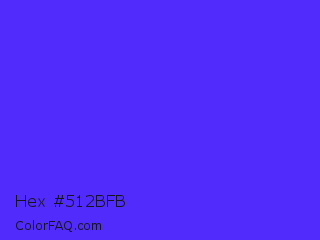Hex #512bfb Color is a normal indigo color and the nearest color is Han Purple #5218fa. Hex code #512bfb and RGB value is rgb(81,43,251). In RGB color space, this color is composed of 32% red, 17% green, 98% blue, In CMYK color space, this color is composed of 68% cyan, 83% magenta, 0% yellow , 2% black , In HSL color space, this color has a hue angle of 251° , 96% saturation and 58% lightness.