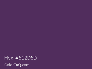 Hex #512d5d Color is a dark purple color and the nearest color is Bossanova #4e2a5a. Hex code #512d5d and RGB value is rgb(81,45,93). In RGB color space, this color is composed of 32% red, 18% green, 36% blue, In CMYK color space, this color is composed of 13% cyan, 52% magenta, 0% yellow , 64% black , In HSL color space, this color has a hue angle of 285° , 35% saturation and 27% lightness.