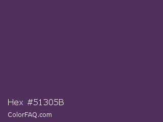 Hex #51305b Color is a dark purple color and the nearest color is Bossanova #4e2a5a. Hex code #51305b and RGB value is rgb(81,48,91). In RGB color space, this color is composed of 32% red, 19% green, 36% blue, In CMYK color space, this color is composed of 11% cyan, 47% magenta, 0% yellow , 64% black , In HSL color space, this color has a hue angle of 286° , 31% saturation and 27% lightness.